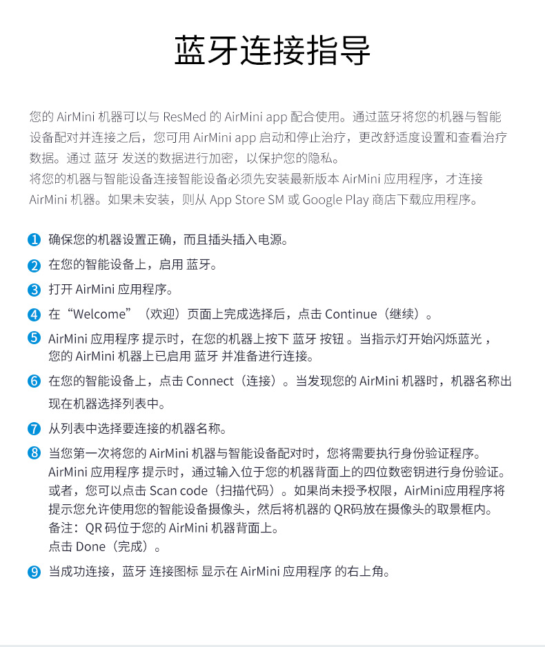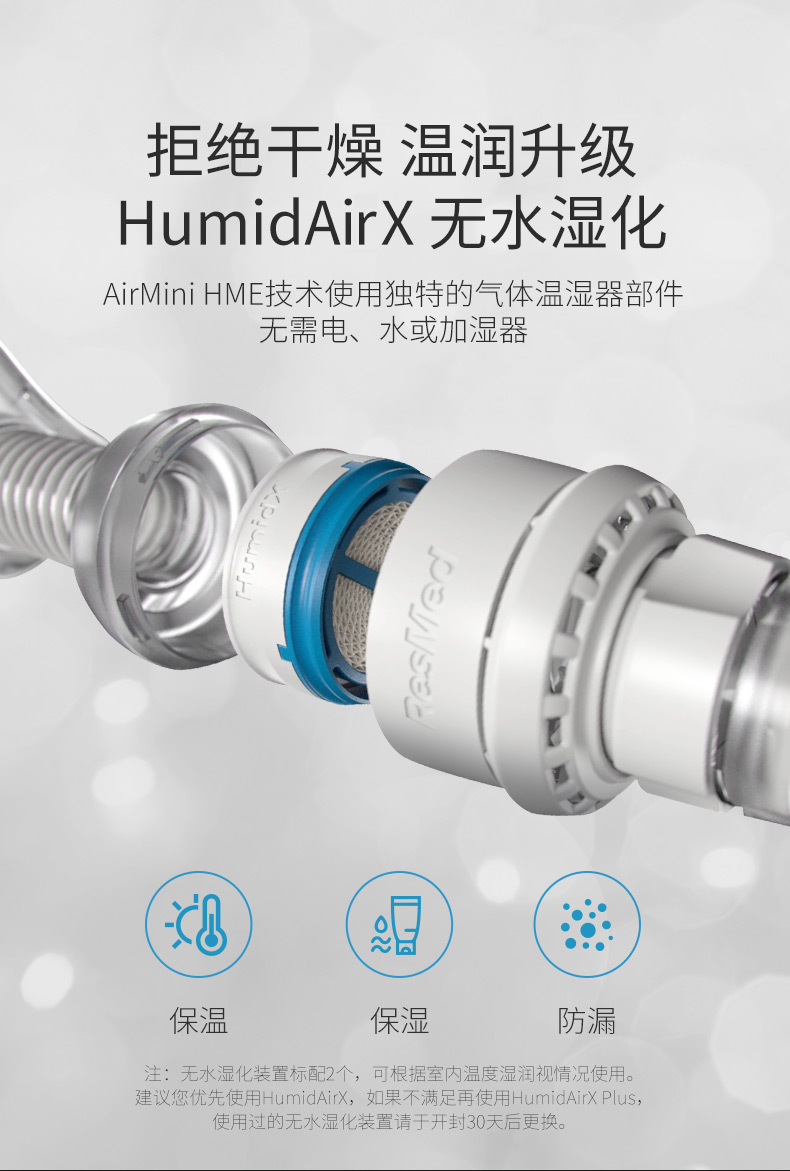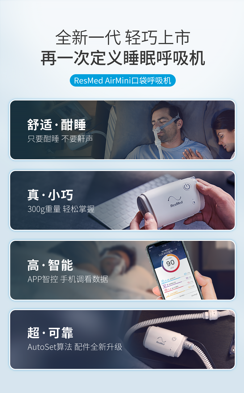 AirMini正壓通氣治療機(jī) l 便攜小巧自由隨行 融匯小巧與輕盈,時尚簡約 便攜自由 隨時隨地輕松治療 l 智享藍(lán)牙智慧舒適 藍(lán)牙連接,APP調(diào)節(jié)參數(shù) 數(shù)據(jù)信息,盡在掌握 無水加濕,舒適睡眠新體驗 l 科技呵護(hù)專業(yè)可靠 三扇葉馬達(dá) Active Airt恒量排氣技術(shù) 算法可靠,個性化治療新選擇